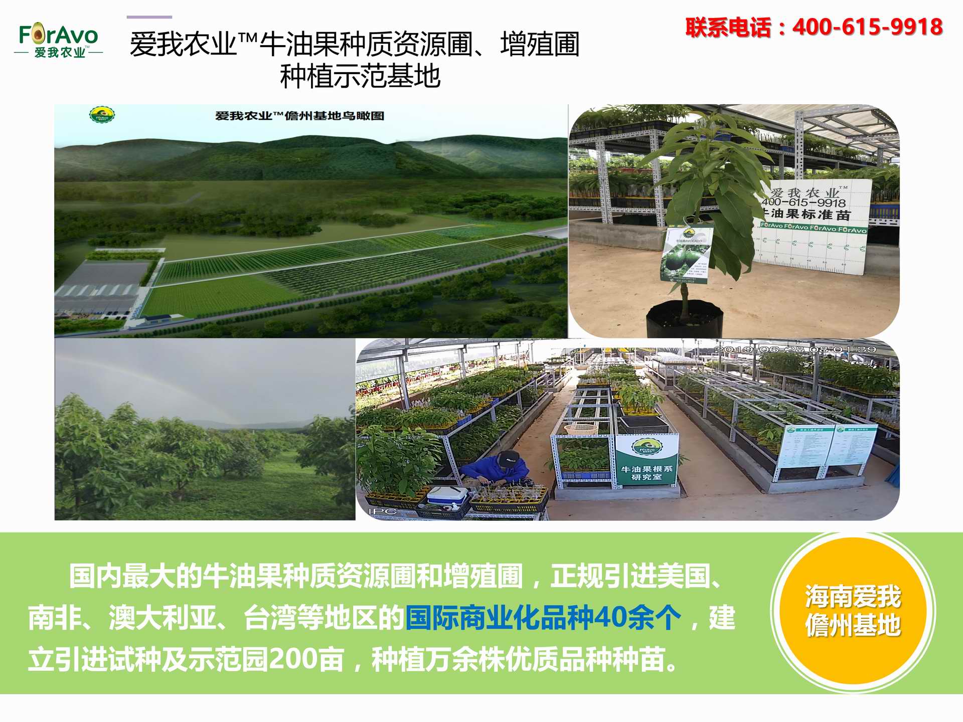海南愛(ài)我農(nóng)業(yè)科技有限公司是一家綜合性的高科技農(nóng)業(yè)發(fā)展企業(yè),旗下愛(ài)我農(nóng)業(yè)TM致力于打造中國(guó)最大最強(qiáng)的牛油果種植企業(yè)。依托美國(guó)、南非、澳大利亞等擁有百年牛油果繁育、種植歷史以及產(chǎn)業(yè)鏈?zhǔn)袌?chǎng)的優(yōu)勢(shì),開(kāi)展牛油果種苗繁育、種植技術(shù),種植加盟、深加工等產(chǎn)業(yè)。結(jié)合中國(guó)市場(chǎng),面向廣大苗圃基地、種植農(nóng)場(chǎng)、合作加工等企業(yè),推出的適合規(guī)模化、標(biāo)準(zhǔn)化的牛油果全產(chǎn)業(yè)鏈服務(wù)。 Hainan Foravo Agricultural Technology Co., Ltd. is a comprehensive high-tech agricultural development enterprise , dedicated to building the largest and most powerful avocado plantation enterprise in China. Relying on the advantage of avocado nursery, planting history, and the industrial chain over 100 years in the United States, South Africa, Australia, we are carrying out nursery, planting, proce...